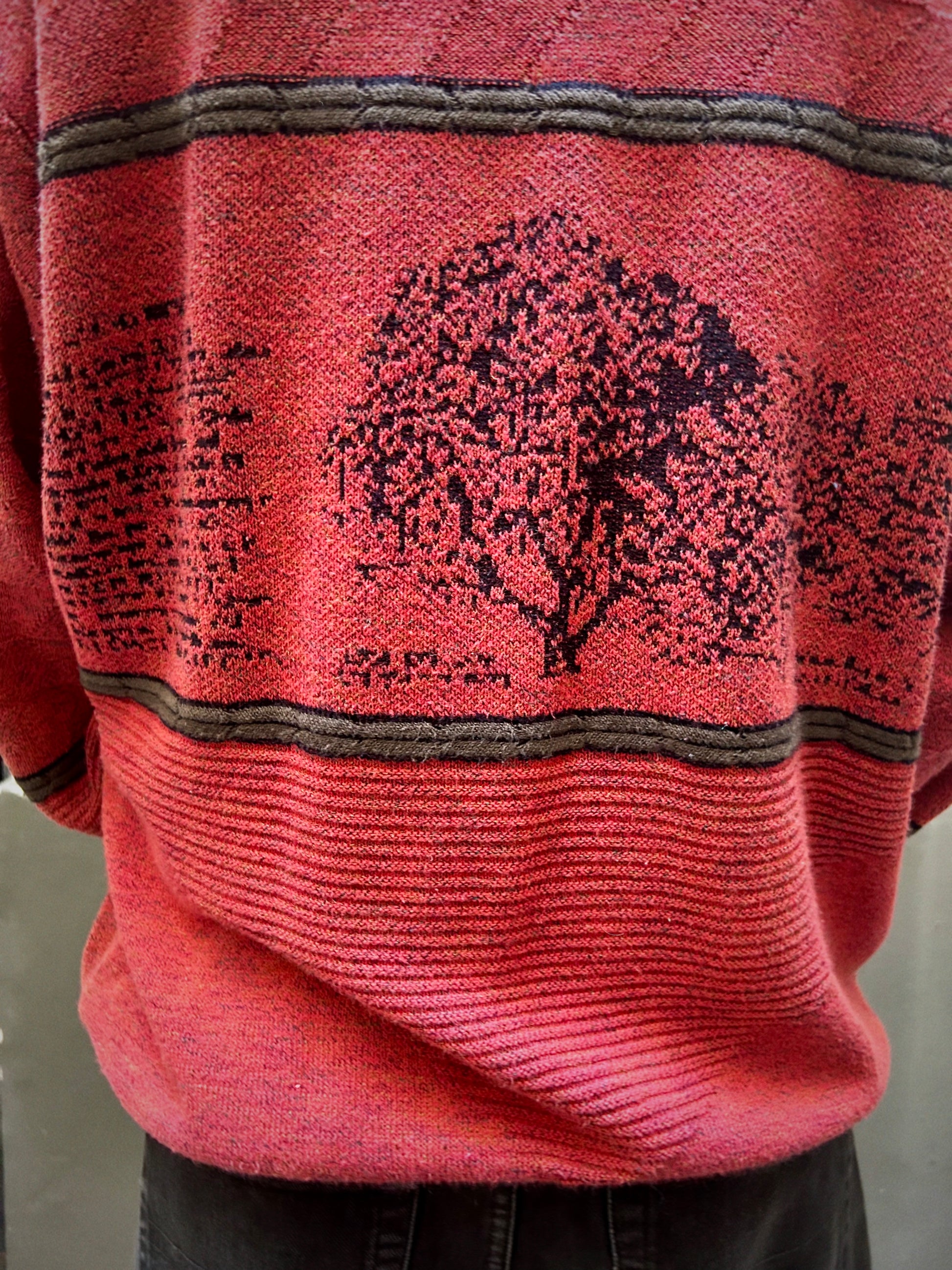 Textured red knit with black landscape graphic and applied embroidered patches. Structured fit with relaxed proportions. Heavyweight feel without being wool — easy to layer, easy to wear.
