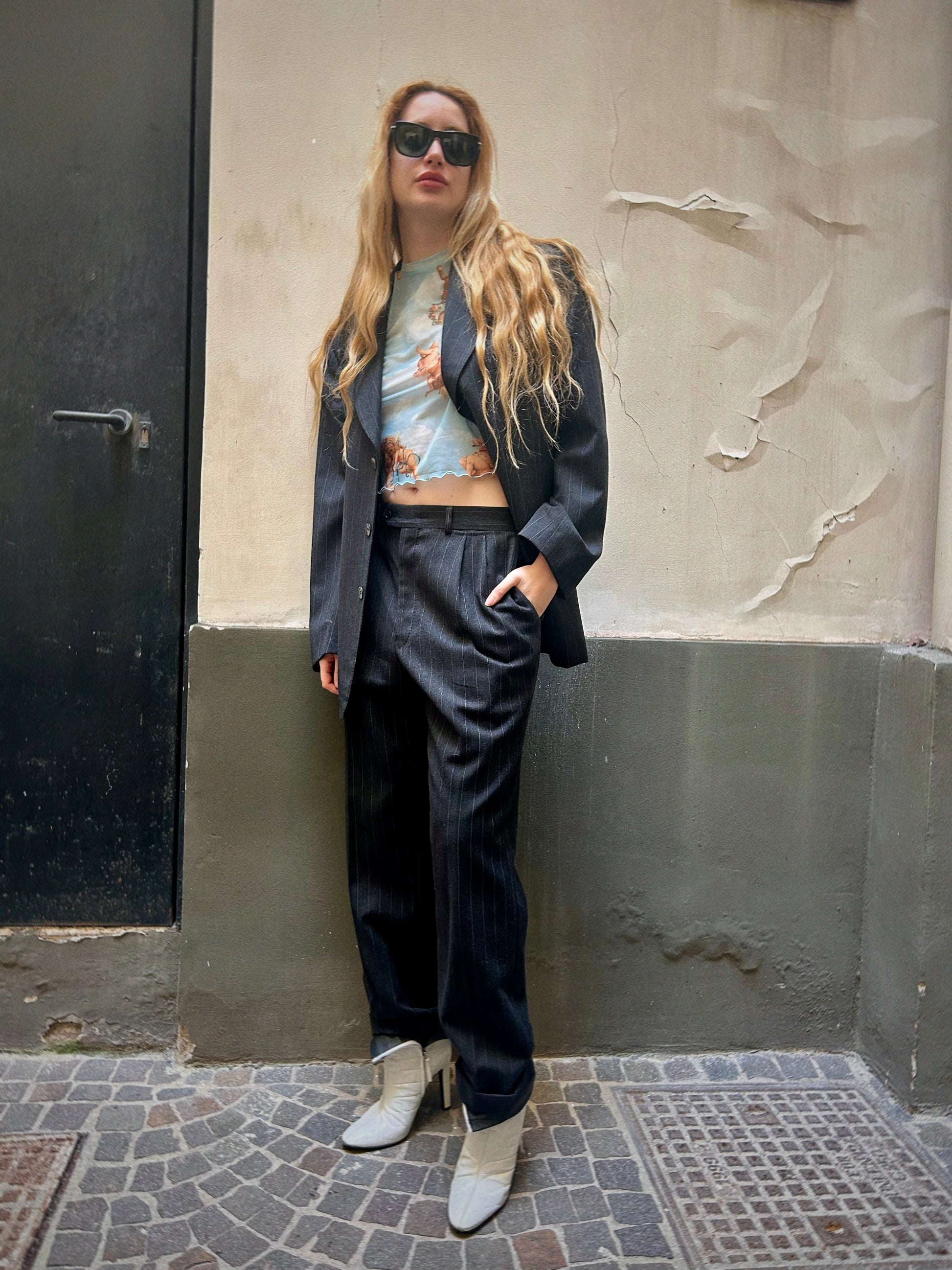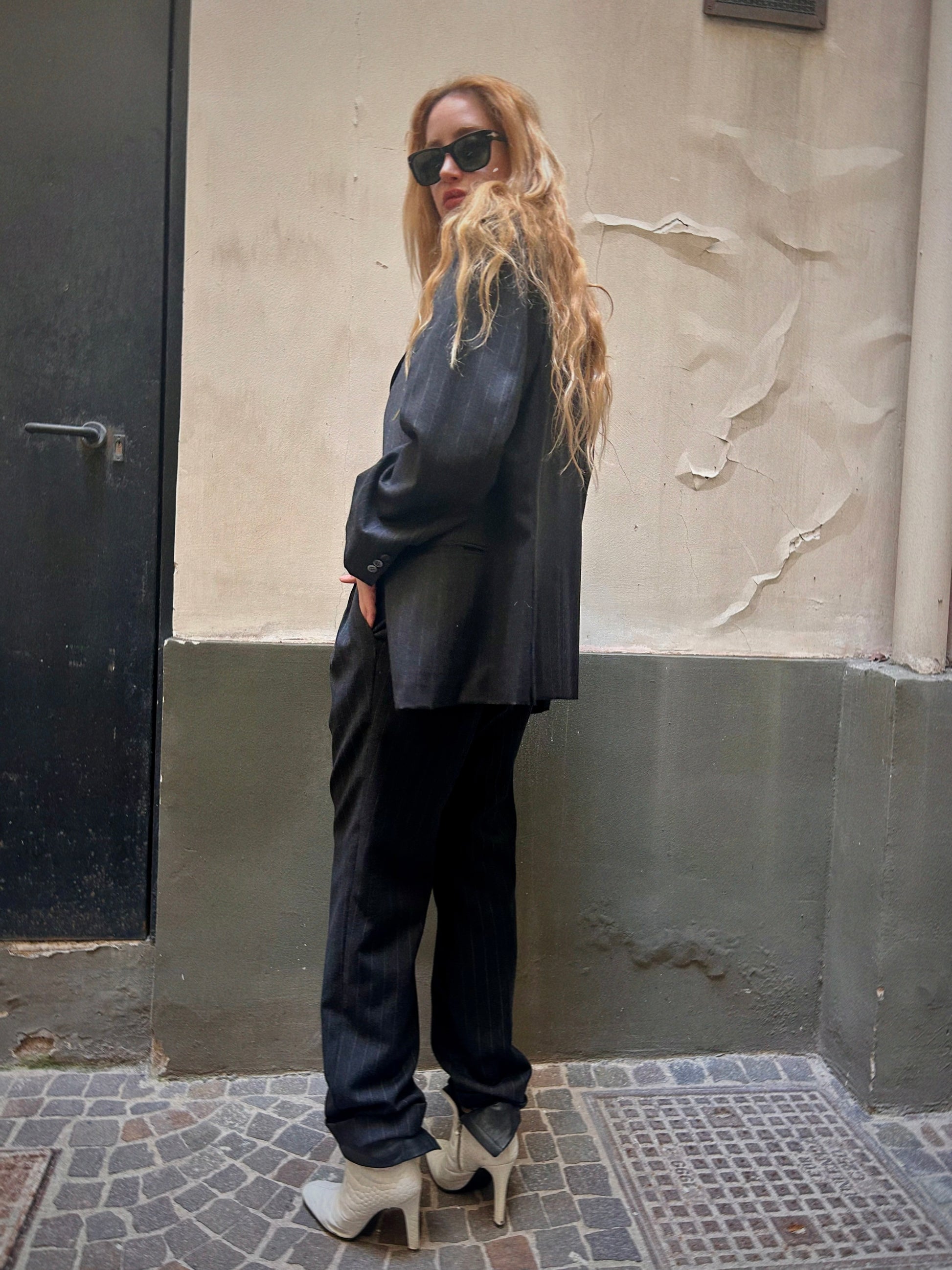 Charcoal wool blend with subtle stripe. Relaxed, slightly oversized tailoring with a structured blazer and high-waisted pleated trousers.